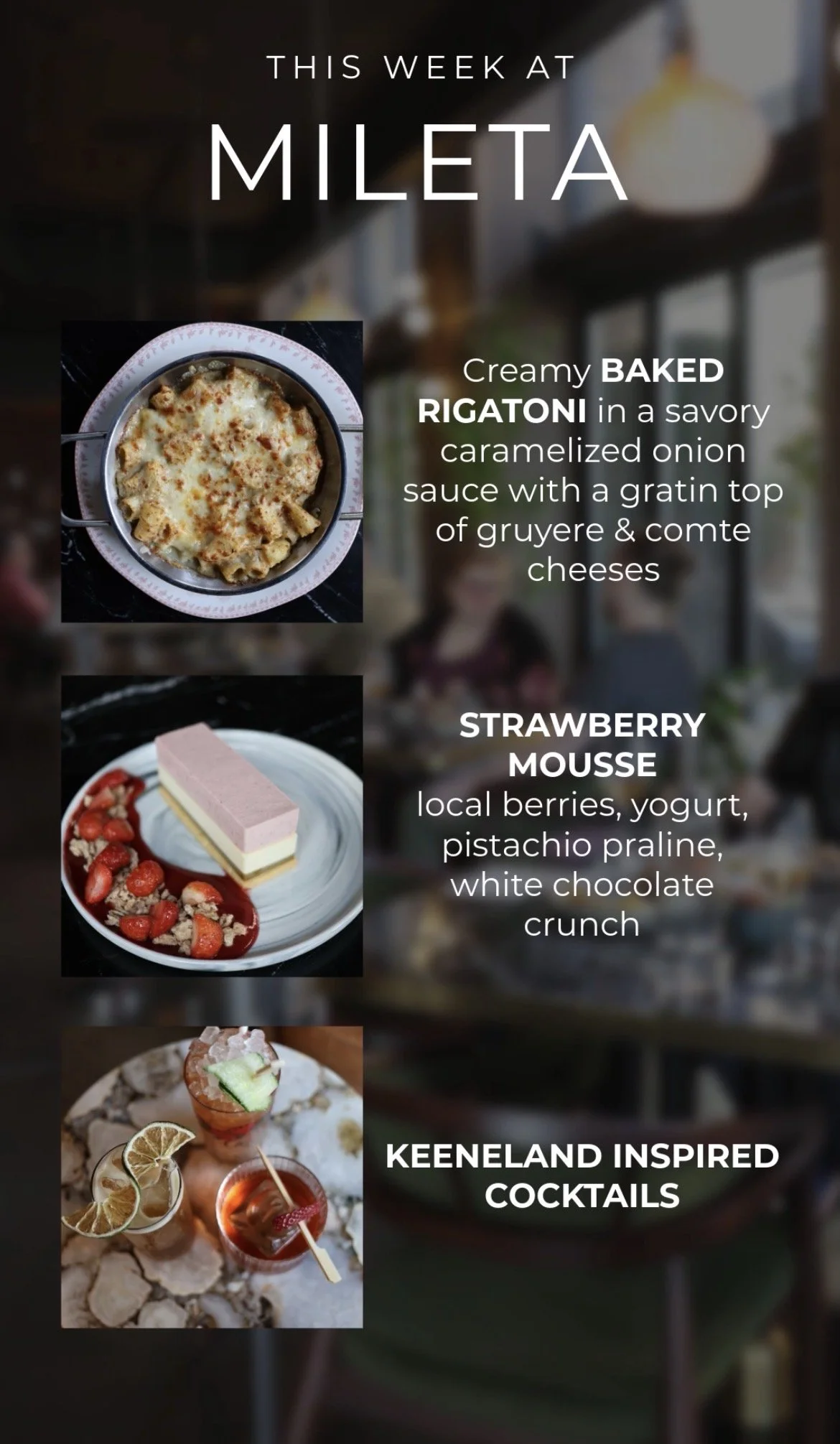 Mileta is a modern, scratch kitchen in Lexington, KY, serving handmade pastas, seasonal dishes, craft cocktails, and a carefully chosen wine list. Led by Managing Partner Dallas Rose and Executive Chef Alex Green, we focus on quality ingredients, thoughtful cooking, and warm, genuine hospitality.